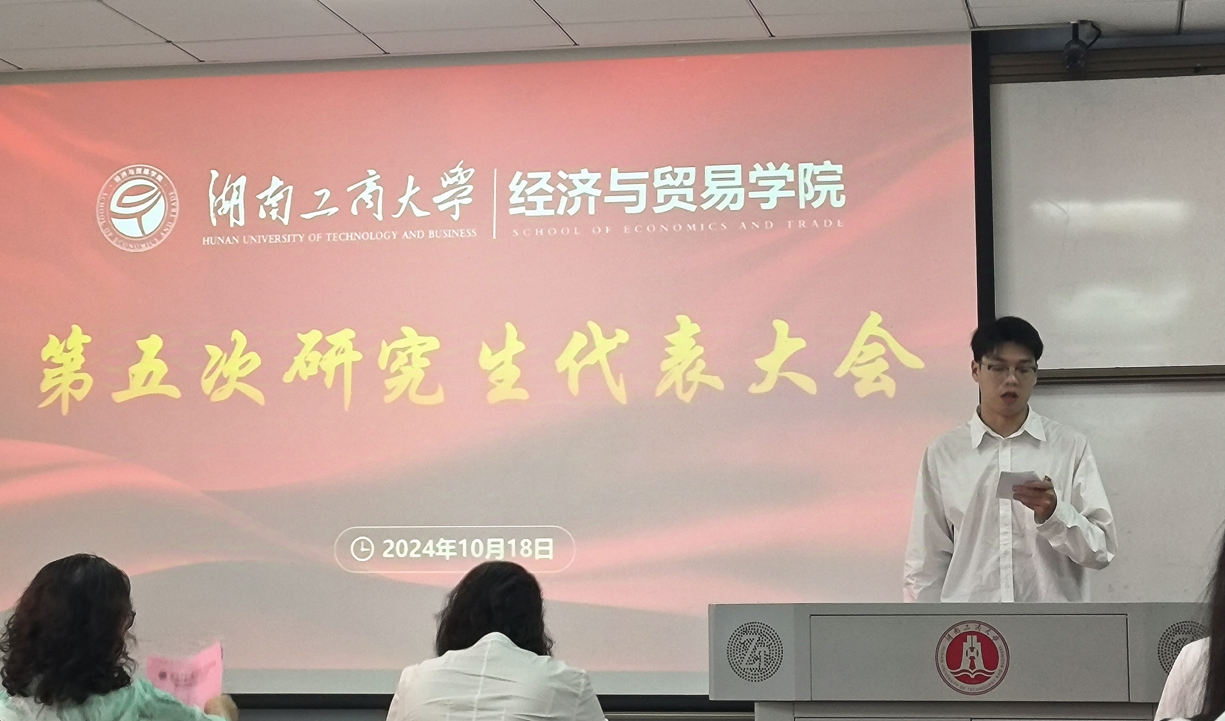 10月18日,经济与贸易学院在湘江楼B416召开了第五次研究生代表大会。学院党委副书记曾倩、学生工作办公室副主任李新雨、团委书记傅凌志、研究生第一党支部书记谢芳老师及学院研究生代表参加。会议由何政同学主持。