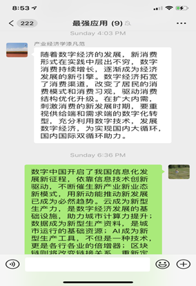 应用经济学19级研究生漆凡范同学的观点认为:“随着数字经济的发展,新消费形式层出不穷,拓宽了消费渠道,改变了消费习惯,逐渐成为经济发展的新引擎。在扩大内需、刺激消费的新发展时期,要重视供给端和需求端的数字转型,为实现国内大循环,国内国际双循环助力。”
