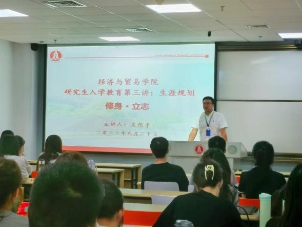 9月20日,经济与贸易学院在经管楼B517召开了主题为“生涯规划:修身·立志”的2022级研究生入学教育讲座。本次讲座由经济与贸易学院副院长吴伟平副教授主讲,谢芳老师、杜佳慧老师以及全体2022级研究生参加了此次讲座。