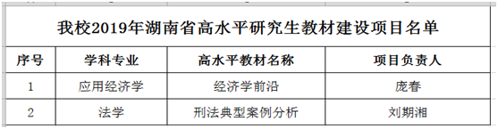 近日,湖南省教育厅公布了2019年湖南省研究生教学平台项目立项名单(湘教通〔2019〕370号),我校推荐申报的16个项目均成功获批立项。其中获湖南省优秀研究生教学团队项目5项、研究生优质课程项目9项、高水平研究生教材项目2项。