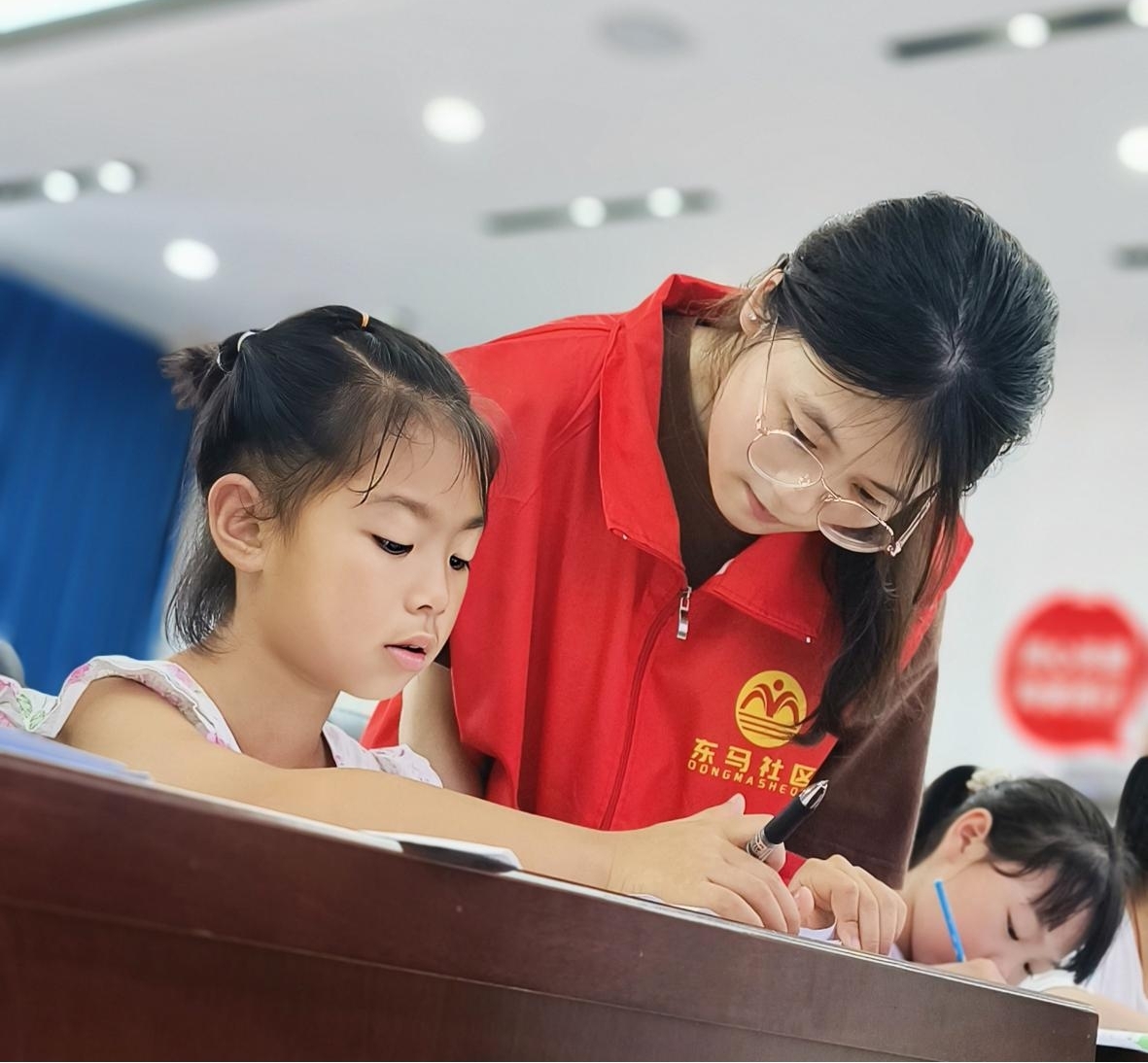 图为志愿者谭露辅导小朋友写作业