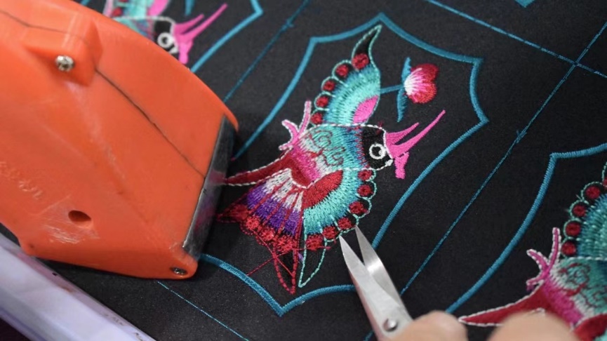 “2018年公司创办至2020年,公司一直坚持手工苗绣,直到2021年,为了顺应市场,公司决定添加机器以机绣为主。”当问到公司当前苗绣生产现状时,麻总这样和队员们说。手工苗绣制作成品耗费时间长、对工人技艺要求高,既无法快速响应市场需求又缺少市场,因此高效生产、物美价廉的机绣成为了苗绣市场的主要生产方式。同时,在科技不断发展、应用领域不断拓展的当下,科技赋能非遗文化也让机绣成品更加精美。