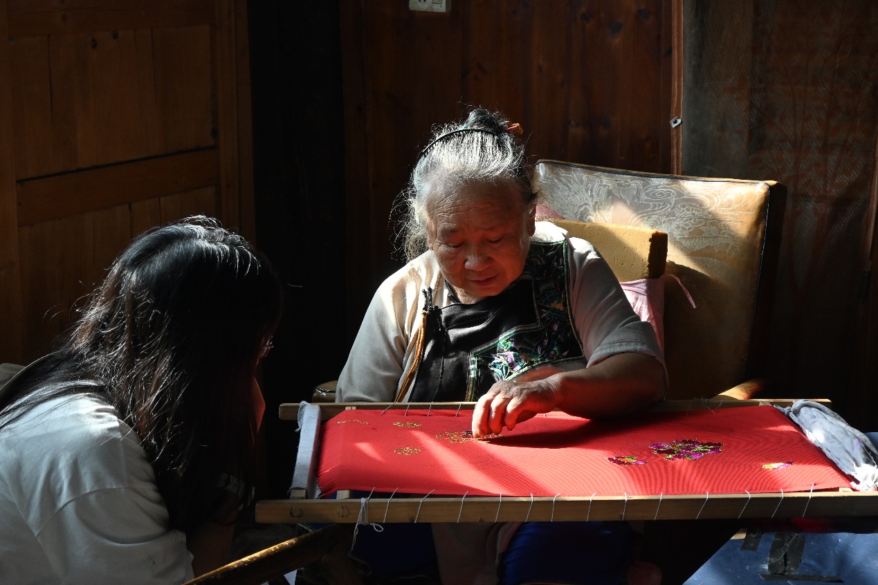 当采访队伍到达梁奶奶家时,梁奶奶坐在门口刺着苗绣。梁奶奶精神矍铄,手中丝线堆叠,指尖生花。她的每一针每一线,都仿佛是在用布作画,以针为笔,以线为墨,勾勒出中寨村的山水风情,织就出一件件龙凤呈祥、色彩斑斓的苗绣佳品,“E路乡伴”采访小队欣赏了梁奶奶的苗绣作品,并跟着奶奶学习苗绣的刺法,亲身体验苗绣文化。