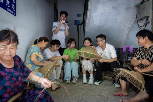 图为队员与匠人访谈并现场观摩斗笠编制技艺的制作