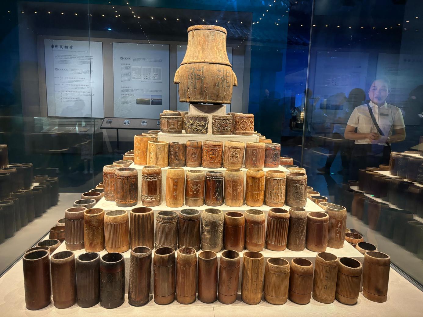 图为摆放整齐的舀米竹筒