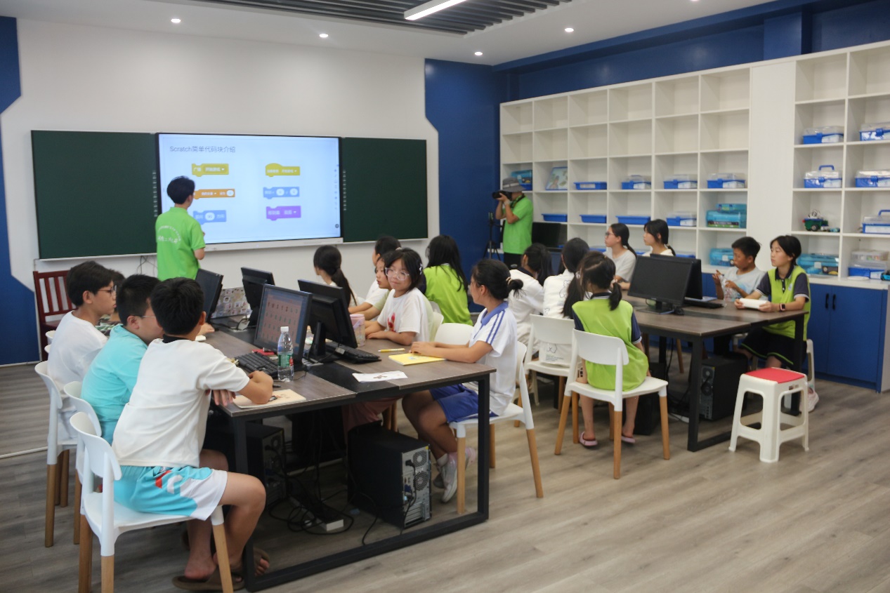 下午,团队带领学生来到了具有现代化设备的教室——科创空间。这里,队员们不仅教授了Scratch编程的基础知识,还邀请了学生上台,与他们一起动手实践。从设计简单的贪吃蛇游戏到模拟烟花绽放效果,孩子们通过编程设计,从而收获乐趣与成就感。