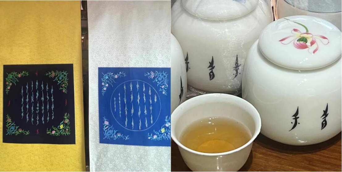 图为女书系列文创产品:刺绣与杯具
