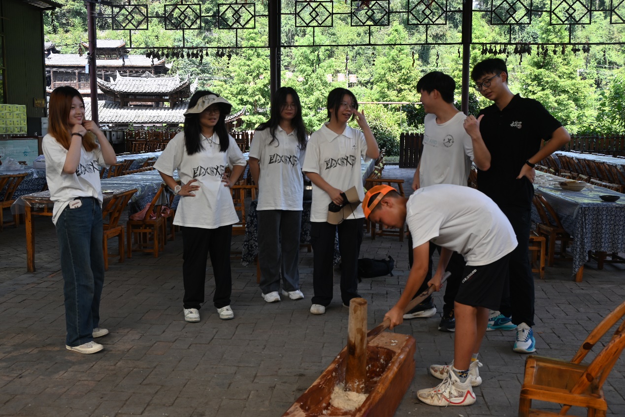 图为E路乡伴小分队体验打糍粑过程