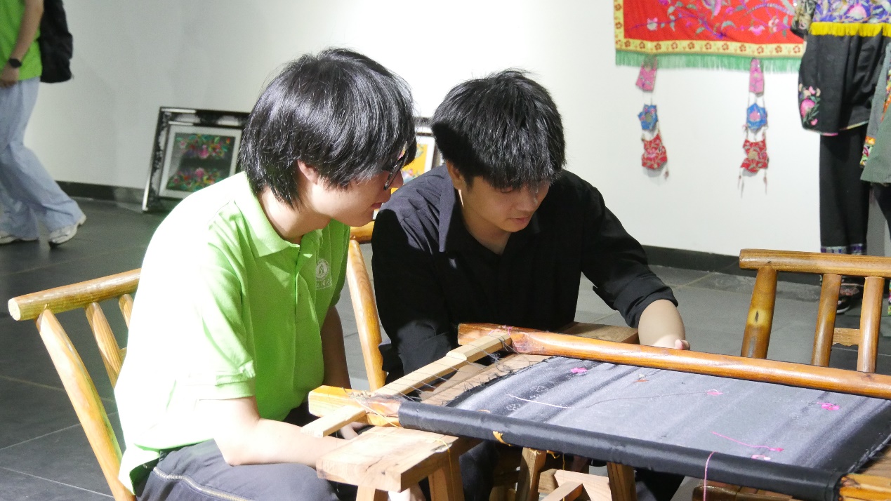 图为队员观摩苗绣展品工艺